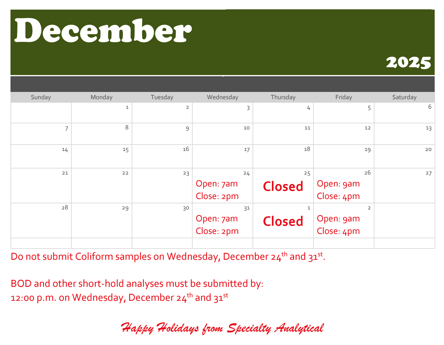 - BOD and other short-hold analyses must be submitted by 12:00 p.m. on Wednesdays of December 24th and 31st